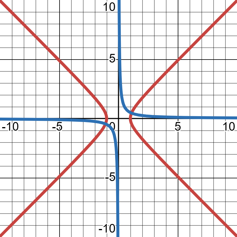먼저 저는 주로 그래핑 계산기에서 복소수 모드를 사용하기에 첫 줄에는 항상 $z=x+iy$를 넣어요. 복소수 변수를 지정해 주는 거죠. 중심이 복소수 $P$이고 반지름이 1인 원을 $|z-P|=1$이라고 나타낼 수 있는 것처럼 음함수 형태의 곡선의 방정식을 복소수로 쉽게 표현할 수 있죠. 아래 그림은 각각 복소수의 실수부와 허수부를 가져오는 기능인 real과 imag를 사용해서 그린 쌍곡선이에요.