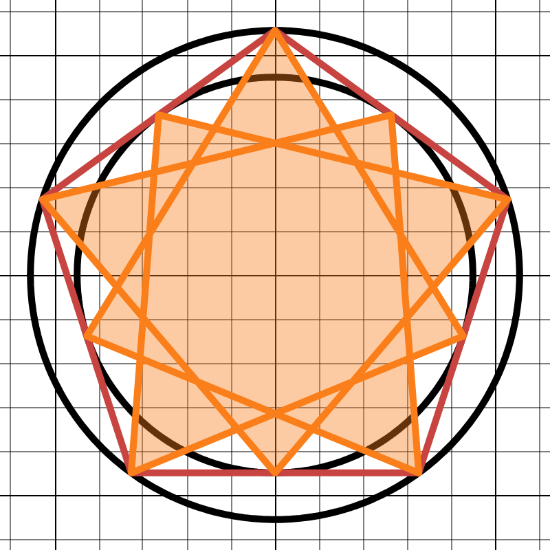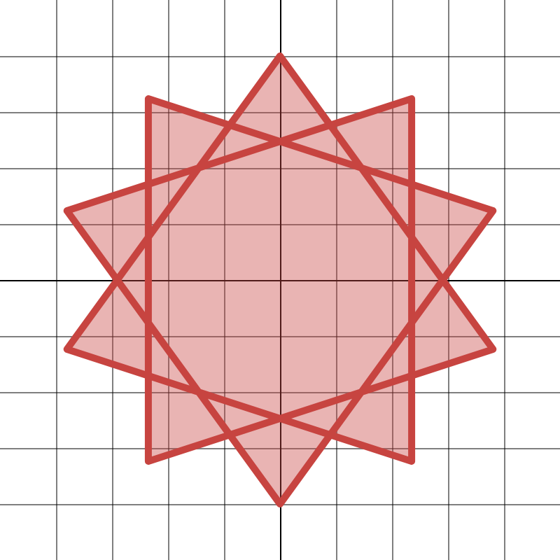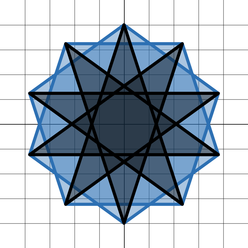 처음 본 사람들은 어떤 도형인지 못 알아보더라구요. 점 위치가 조금 들쭉날쭉하지만 이 도형은 십망성 decagram이죠. 일부러 더 예쁘게 만들려고 꼭짓점 위치를 조정한 거예요. 색은 desmos에서 기본적으로 사용되는 색에 제가 좋아하는 계열이 있길래 골라봤어요.